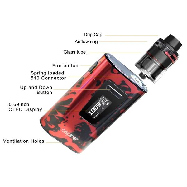 Aspire Typhon 100 100W Revvo Starter Kit Starterset mit Revvo Tank ist das brandneue Aspire Kit, das von einer eingebauten 5000mAh Batterie angetrieben wird und eine maximale Leistung von 100W erreicht, die Ihnen ein tolles Vaping Erlebnis bietet. Aspire Typhon 100W Kit kommt mit einer kompakten Größe und modischem Design. Aspire Typhon Mod kommt mit einem 0,69 Zoll OLED-Bildschirm, der Dampfdetails klar zeigt. Die verschiedene Ausgabemodi einschließlich VW, VV, Bypass, CPS und TCR werden von diesem Geräte unterstützt. Der im Lieferumfang enthaltene Aspire Revvo Tank hat eine 3,6 ml E-Saft Kapazität, die die neue ARC Coil, Aspire Radar Coil, enthält, wo die Coil selbst horizontal im Tank sitzt, ähnlich wie ein „Herd“ für fantastischen Geschmack und riesige Dampfproduktion. Der Revvo-Tank mit 24 mm Durchmesser unterstützt den oberen einstellbaren Luftstrom und das Top-Füllsystem, um Ihnen vollen Dampfspaß zu bieten.